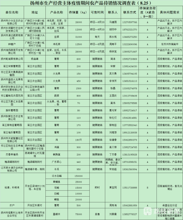 我苏网讯 8月24日,扬州市商务局和市农业农村局共同发布,第一批疫情期间,扬州市滞销农户和寻求帮助农户的联系方式和需求。今天(8月25日),第二批滞销农户的联系方式来了。