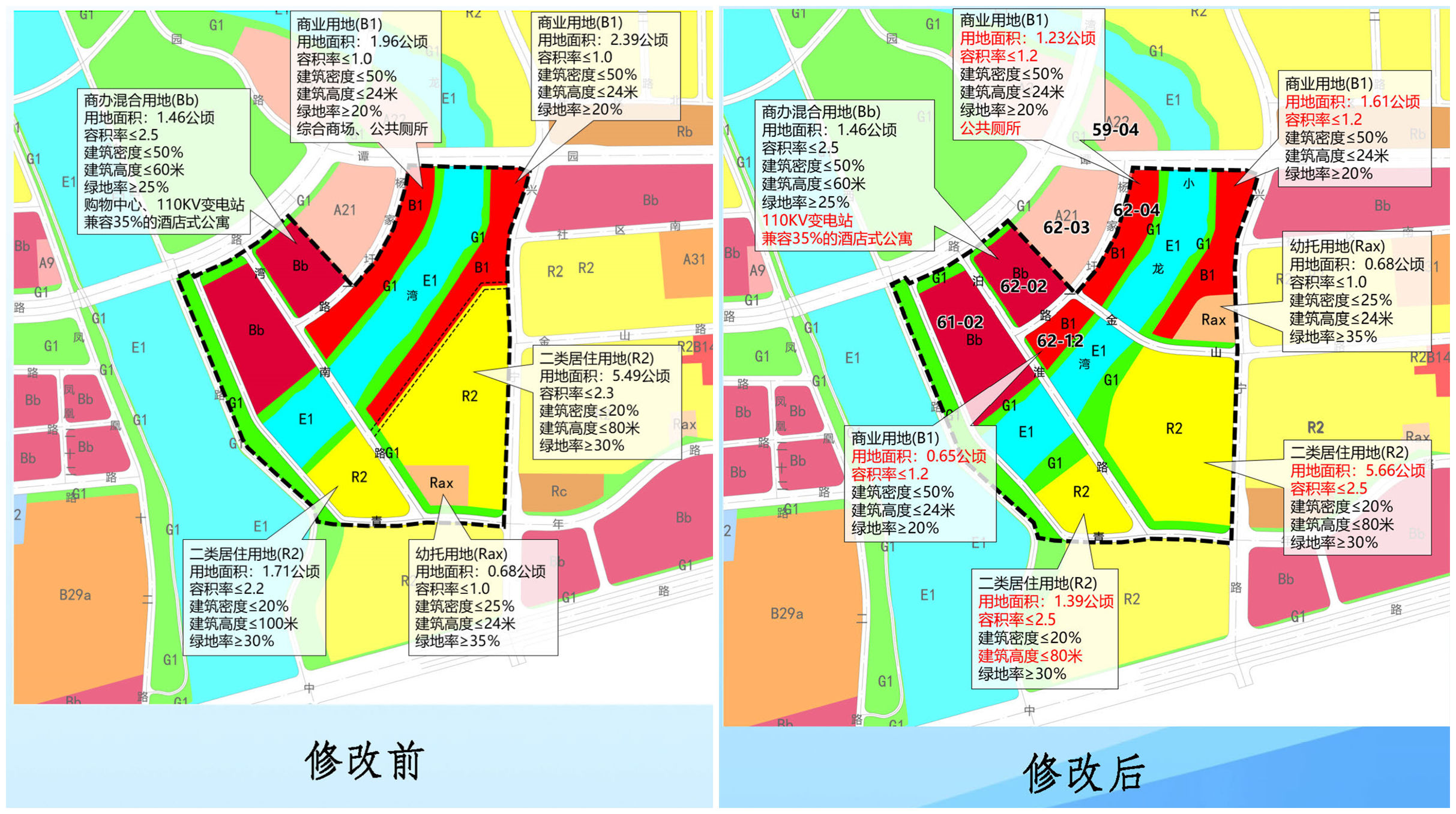 根据规划文件显示,区域内将新增1幅二类居住用地,地块10-14从原来的防护绿地用地修改为二类居住用地,用地面积2.72公顷,容积率<2.4,建筑高度<80米。