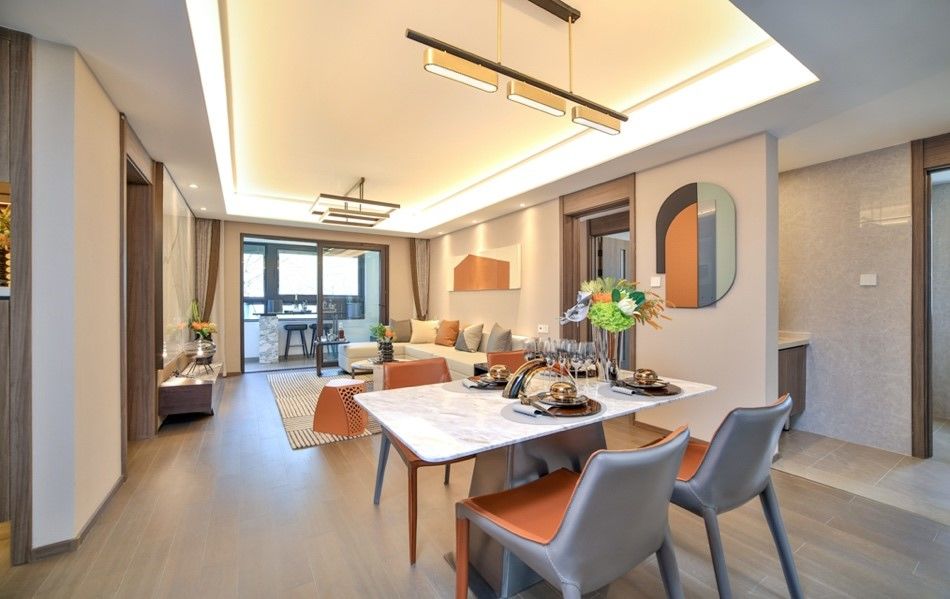 使两个起居空间与客厅一字排开,既保证了充足的阳光与清风,更让窗外的龙湖五维园景,成为点缀每日生活的背景,旨在让六合居者,感知有温度的美好生活