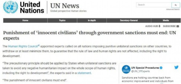 早在今年3月,多位联合国人权专家就曾警告,美国对多个国家实施的单边制裁严重侵犯了这些国家的人权。本月11日,由联合国人权理事会任命的几位独立专家再次警告,单边制裁导致委内瑞拉、古巴、叙利亚和伊朗等目标国家的人们被剥夺了发展权,影响到这些国家的经济改善和民众的个人发展。