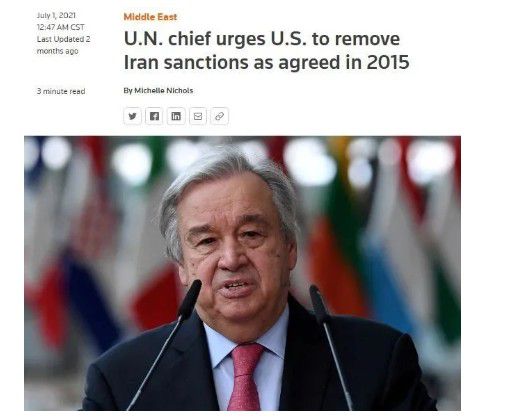 在今年6月底举行的联合国安理会伊朗核问题公开会上,联合国秘书长古特雷斯敦促美国政府依照2015年伊核协议规定尽快解除对伊朗的一切制裁。