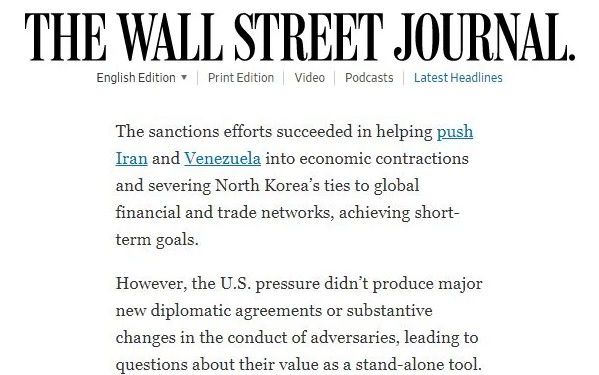 一直将制裁作为外交工具的美国正经历一次又一次外交失败,就连“赞赏”拜登政府从前任“单边制裁”转向“组团制裁”的《华尔街日报》也承认,“制裁虽然推动了伊朗和委内瑞拉的经济收缩,切断了朝鲜与全球金融和贸易网络的联系,但美国的施压并没有促成新的重大外交协议,也没有实质性地改变对手的行为,这导致人们越来越质疑制裁作为独立工具的价值”。