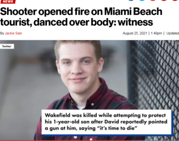 韦克菲尔德的家人告诉《迈阿密先驱报》,当时他正在那里度假,事件发生时他正试图保护他1岁的儿子,然后遭到多次枪击。