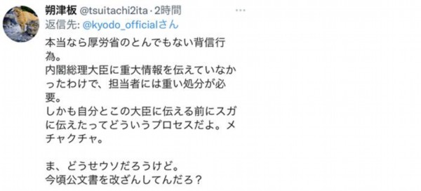 还有网友顺着上述逻辑批评说,“如果是真的,负责人应该重罚,而且在向厚生劳动大臣传达前先向首相汇报,到底是个什么程序?乱七八糟”,该网友后还继续抨击,“不过,反正都是谎话吧,我想现在正在篡改政府文件吧?”↓
