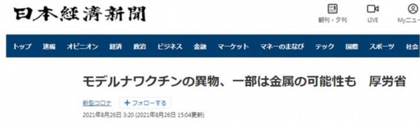 《日本经济新闻》报道称,厚生劳动省26日表示,收到来自日本国内多个接种场馆报告,报告显示,一部分莫德纳疫苗中存在的“杂质会受到磁铁吸引,可能包含金属成分”。富士新闻网(FNN)报道援引一名厚生劳动省官员的话称,杂质可能是金属片。