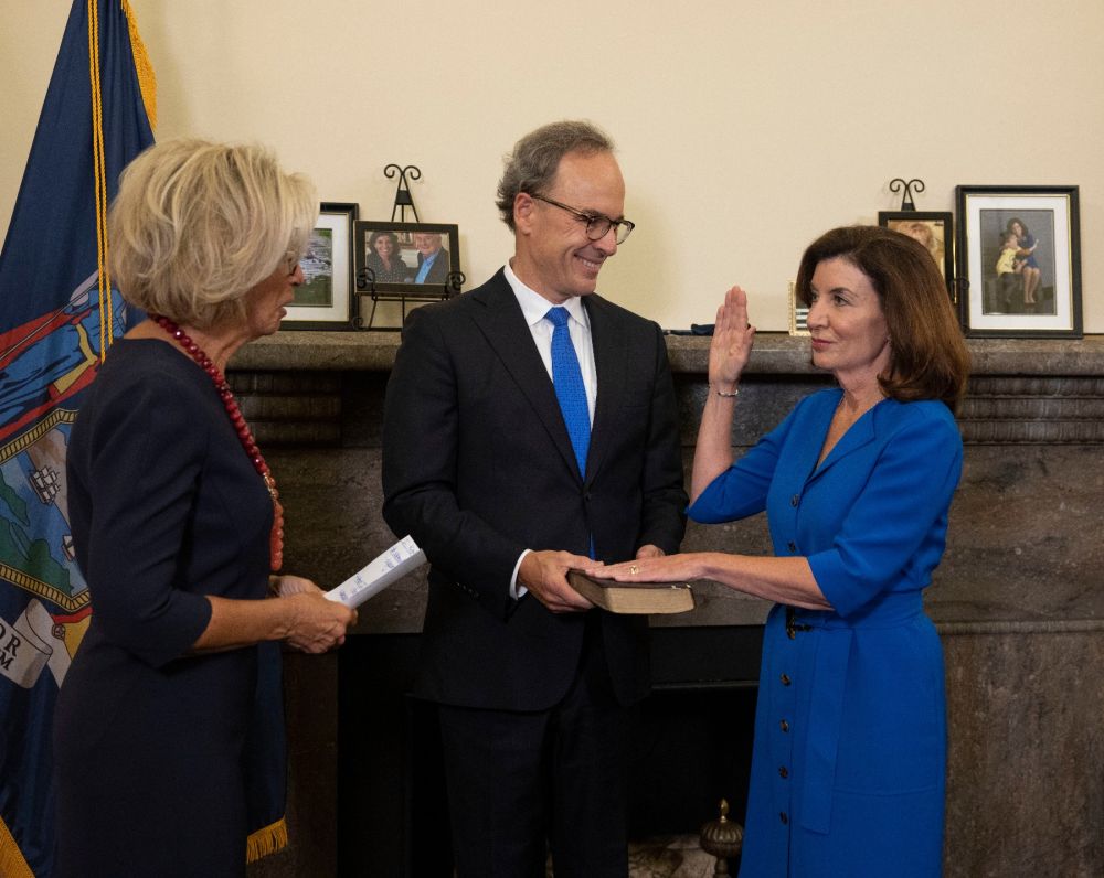 8月24日,凯茜·霍楚尔(右)在美国纽约州首府奥尔巴尼宣誓就任纽约州州长。上一任州长安德鲁·科莫因性骚扰丑闻被迫辞职。(新华社发,纽约州长办公室供图)