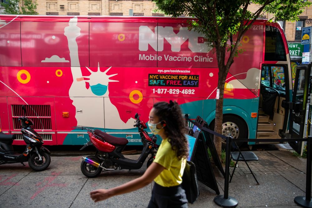 8月23日,行人经过美国纽约一个新冠疫苗接种点。(新华社发,郭克摄)