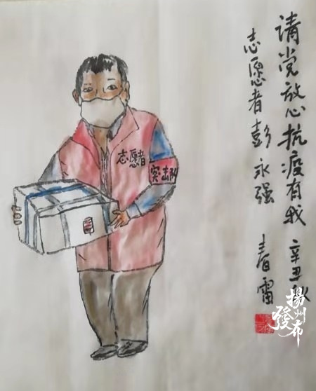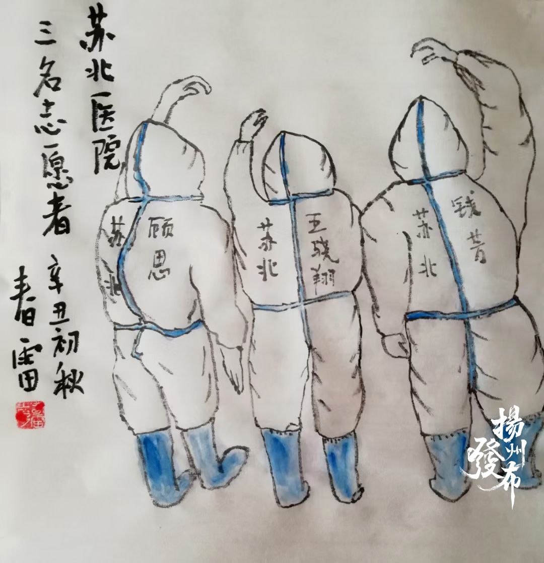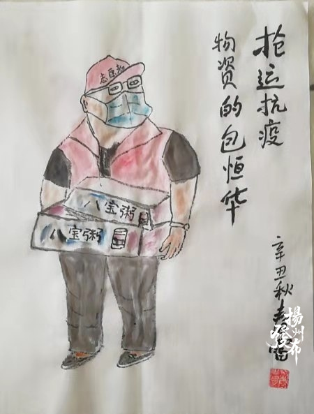 沈春雷说,扬州志愿者舍小家为大家,是最美“逆行者”,这激励他拿起画笔为他们讴歌,表达对他们的敬意 。