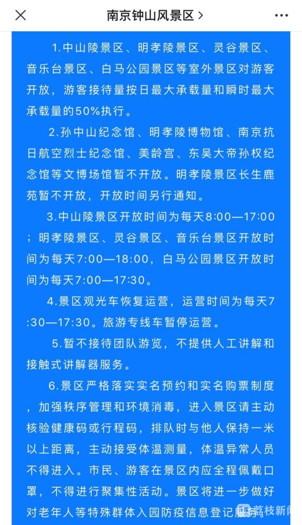 南京钟山风景区也发布公告,宣布室外景区有序有限恢复开放。其中,中山陵景区、明孝陵景区、灵谷景区等室外景区对游客开放,游客接待量按日最大承载量和瞬时最大承载量的50%执行;孙中山纪念馆、明孝陵博物馆、美龄宫等文博场馆暂不开放。