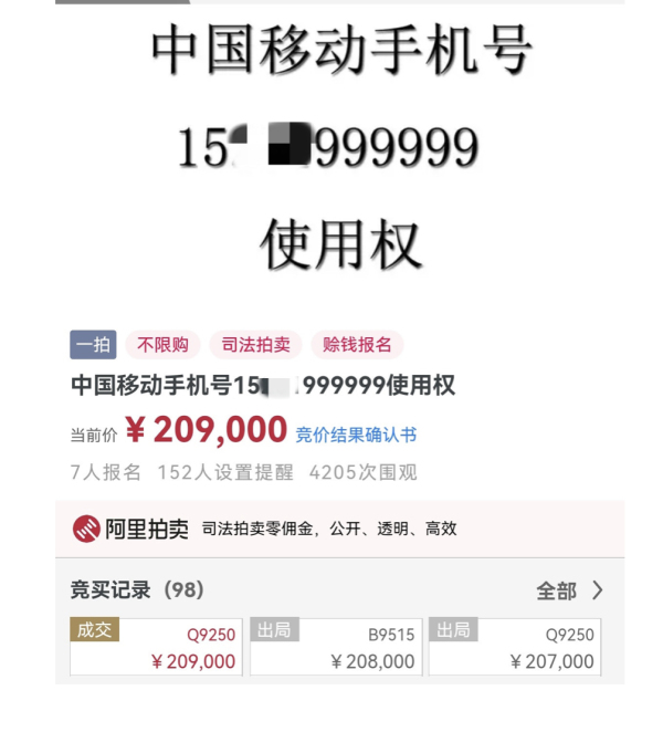 4203次围观,152人设置提醒,7人报名,98次竞价,85次延时,今天,记者从溧阳法院获悉,溧阳市人民法院司法拍卖平台公开拍卖被执行人尾号“999999”手机号码,经过激烈竞拍,最终以20.9万元成交!