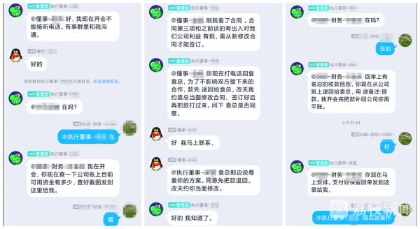 这时“法人代表”提出这个合同有问题,他跟“董事”在群里探讨了很多细节,最后要求小许加急办理,先从公司账上借款将133.5万元退回对方账户,待他开完会把款补回公司再平账。