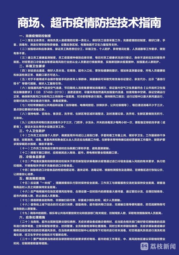 (二十一)要严格按照当地政府及联防联控机制要求抓好商场、超市防疫工作落实,中、高风险地区建议采取缩短营业时间、控制顾客数量等措施。