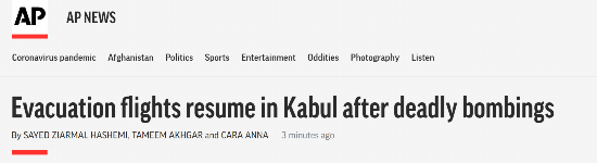 美联社刚刚消息称,有目击者说,在致命炸弹袭击一天后,喀布尔机场的撤离航班已经恢复。