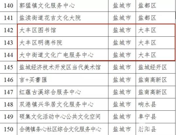 日前,省文化和旅游厅公布了2021年度省“最美公共文化空间”打造对象名单。大丰区图书馆、大丰区明德书院、大中街道文化广电服务中心成功入选。