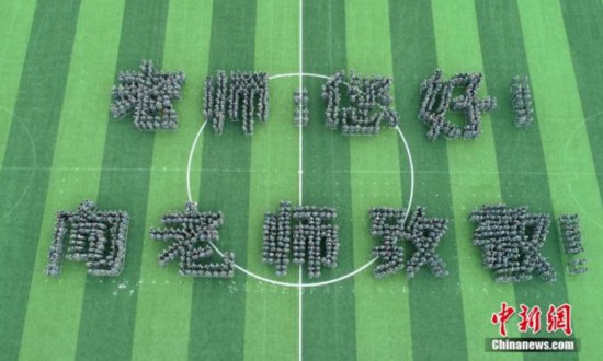 资料图:2018年9月9日,四川眉山,150多名大学生操场上摆出祝福老师字样。中新社记者 刘忠俊 摄