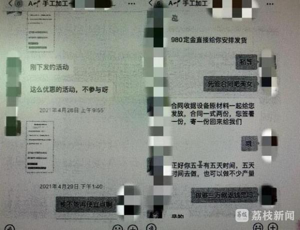 很快,自称是某渔具代加工公司的客服联系上了他,详细介绍了公司的业务和代加工的流程。对方称,所有原材料都由厂家长期免费提供,做好的产品由厂家统一回收,并支付加工费,客户只需预付设备押金,工期内将成品做到一定的量且验收合格后,即可退还这笔押金。为了打消陈先生的顾虑,客服还邀请他到公司进行实地考察。