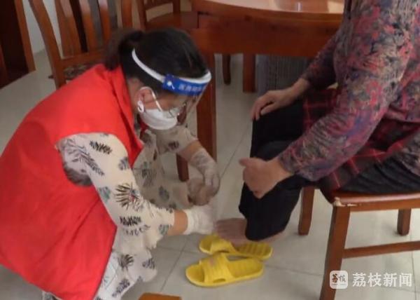 有了专业人士的帮忙,老人焦躁的情绪慢慢稳定下来。交谈中,志愿者张志梅敏锐地发现,老人在家光脚穿拖鞋,看着老人弯腰穿袜很吃力,她一边蹲下帮忙,一边悉心叮嘱。张志梅说:“你袜子没穿可不行,这个受凉!来,我帮你把袜子穿起来吧。”