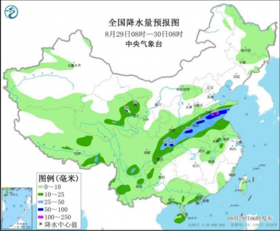预计,8月29日8时至30日8时,四川东北部、重庆北部、陕西南部、湖北西北部、河南中部、山东中南部、苏皖北部等地部分地区有大到暴雨,其中,山东中南部等地局地有大暴雨(100~120毫米)。上述部分地区伴有短时强降水(最大小时降雨量20~40毫米,局地可超过50毫米)。中央气象台29日6时继续发布暴雨蓝色预警。