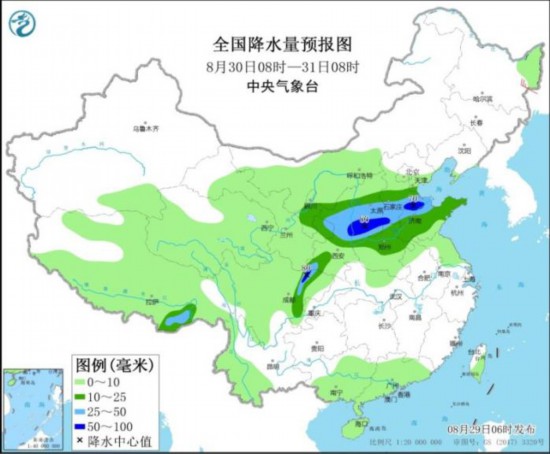 8月30日8时至31日8时,西北地区东部、华北中南部、黄淮大部、四川盆地西部等地部分地区有中到大雨,其中,陕西中部、山西南部、河北南部、山东北部、四川盆地西北部等地部分地区有暴雨(50~80毫米)。