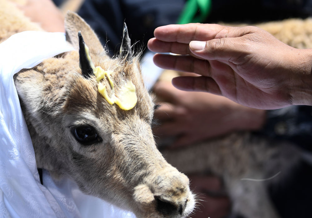 2021年7月7日,在可可西里索南达杰保护站野生动物救助中心,五只人工救助的藏羚羊被放归大自然。这是可可西里巡山队员按照风俗,在藏羚羊额头上涂抹酥油表达祝福。新华社记者张龙 摄