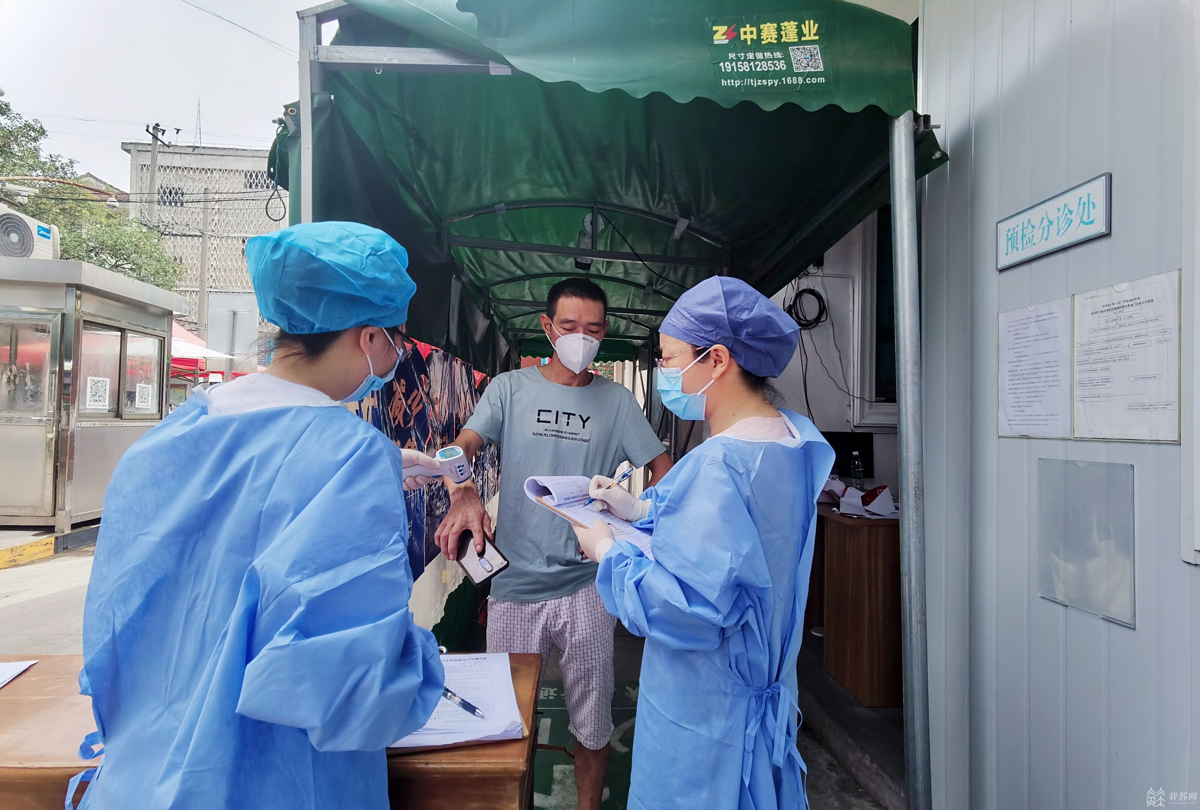 卫生院从临床各科抽调业务水平过硬的骨干人员,充实预检分诊医护力量,对所有来院人员进行登记、监测、筛查,引导有序就诊。盛夏烈日,穿着隔离衣在室外工作,一个班次下来,嗓子嘶哑了,衣服湿透了,但他们毫无怨言和退缩,“为了群众和医院职工的安全健康,这点‘烤验’不算什么。”