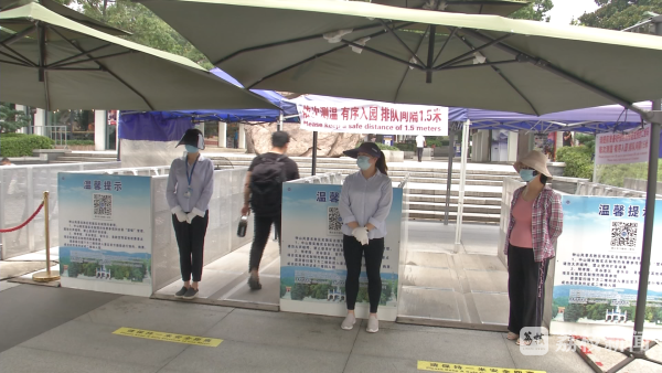 第二道"关卡"处,用铁栏杆隔出了排队通道,张贴了二维码预约海报和游览提醒,市民凭预约二维码或者身份证在闸机上查验,戴好口罩,接受测温后进入。“客流量大概恢复到了疫情以前的两成左右,景区也严格按照防疫要求做好各项防疫措施,保障游客安全入园。”南京中山陵园管理局票务中心综合服务科科长丁曙表示。