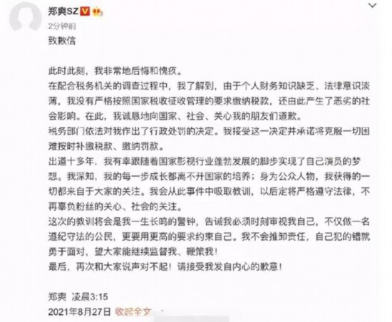 在8月27日凌晨发布的道歉声明中,郑爽表示:“由于个人财务知识缺乏、法律意识淡薄,我没有严格按照国家税收征收管理的要求缴纳税款,还由此产生了恶劣的社会影响。”