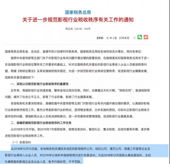 时间追溯到2018年。国家税务总局发布了《关于进一步规范影视行业税收秩序有关工作的通知》,通知里明确要求:“从2018年10月10日起,各地税务机关通知本地区的影视制作公司、经纪公司、演艺公司、明星工作室等企业及影视行业高收入从业人员,对2016年以来的申报纳税情况进行自查自纠。凡在2018年12月底前认真自查自纠、主动补缴税款的影视企业及从业人员,免予行政处罚,不予罚款。”