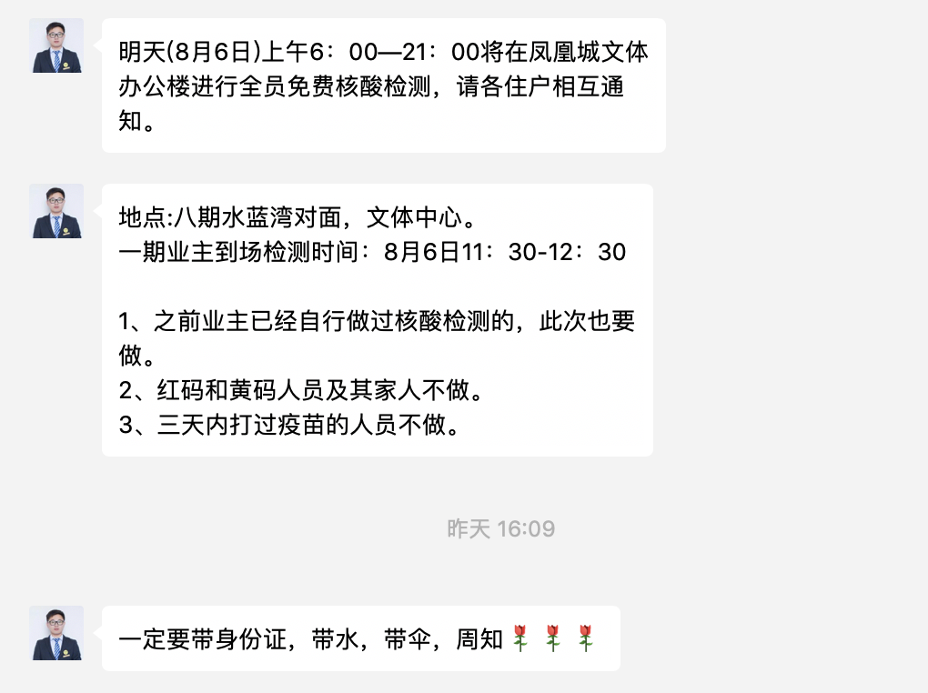 8月5日,凤凰城物业接到社区通知,将在凤凰城设立两个核酸检测点,分别为附近企业和工地、业主进行核酸检测。