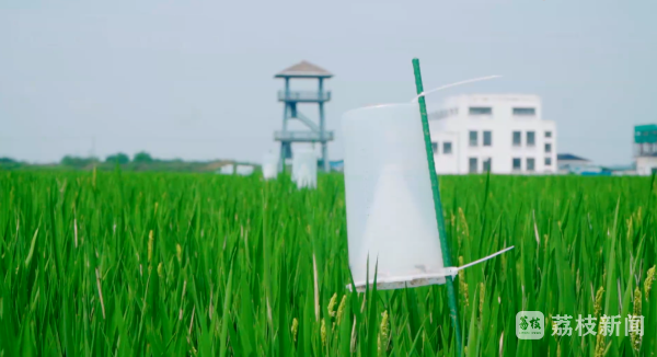 眼下,江苏的水稻正陆续进入破口抽穗期,也是重大病虫害防控的重要窗口期。8月31日,记者来到了位于南京市溧水区和凤镇的3000亩生物防治示范区,一望无际的翠绿色稻田里,每隔几米就整齐地竖立着一个白色小罩灯似的器具,仔细一看,里面还隐约可见有一些飞虫蛾子。