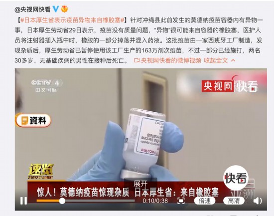 针对冲绳县此前发生的莫德纳疫苗容器内有异物一事,日本厚生劳动省29日表示,疫苗没有质量问题,“异物”很可能来自容器的橡胶塞,医护人员将注射器插入瓶中时,橡胶的一部分掉落并混入药液。这批疫苗由一家西班牙工厂制造,发现杂质后,厚生劳动省已暂停使用该工厂生产的163万剂次疫苗,不过一部分已经施打,两名30多岁、无基础疾病的男性在接种后死亡。