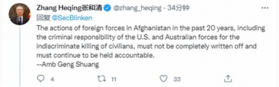 “外国部队过去20年在阿富汗的所作所为,包括美国、澳大利亚军队滥杀平民的刑责,绝不能一笔勾销,必须继续予以追究。-中国常驻联合国副代表耿爽”