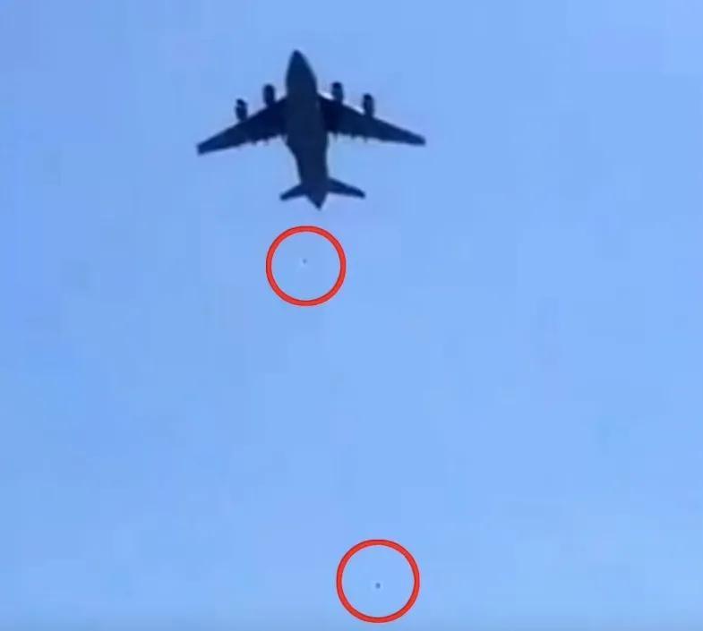 出现混乱场面的同时,美国军用飞机,仍照常起飞撤离,有人从飞机的起落架处坠落。