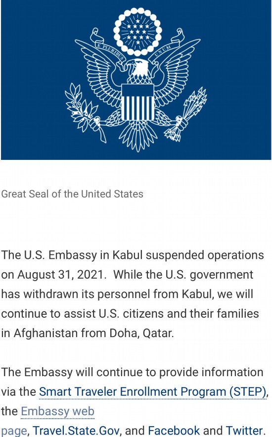 通告中表示,尽管美国政府已从喀布尔撤出相关人员,但仍将继续在卡塔尔多哈为阿富汗境内的美国公民及其家人提供帮助。
