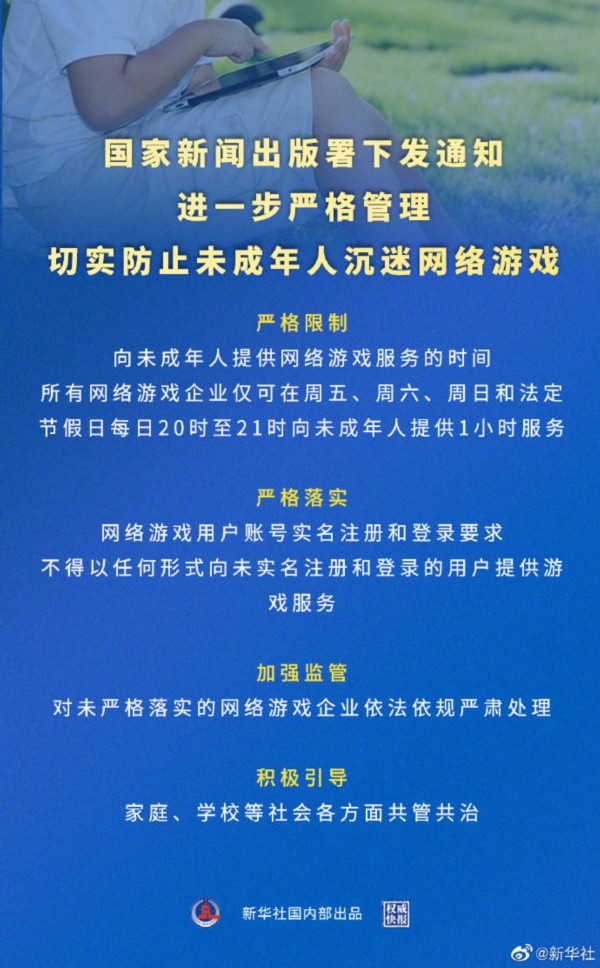 新华社北京8月30日电 近日,国家新闻出版署下发《关于进一步严格管理 切实防止未成年人沉迷网络游戏的通知》,针对未成年人过度使用甚至沉迷网络游戏问题,进一步严格管理措施,坚决防止未成年人沉迷网络游戏,切实保护未成年人身心健康。