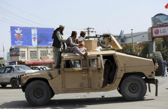 在喀布尔街头巡逻的塔利班,驾驶的是美制悍马装甲车。图源:人民视觉