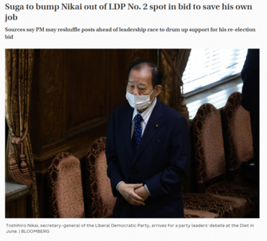 报道称,二阶俊博曾为菅义伟在去年9月的自民党总裁选举中获胜铺平了道路。他先于其他党内大佬宣布支持菅义伟,而其他高层也迅速追随二阶俊博去支持菅义伟。