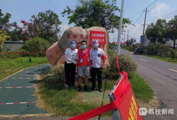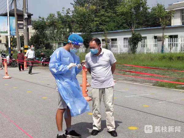 在仪征市新集镇天安村核酸检测现场,天安村妇代会主任高娟穿梭在核酸检测人群中维护秩序;高娟18岁的儿子张高旭汗流浃背,正在搬运物资;在不远处,高娟的丈夫张勇也在默默值守。一家三口顶烈日、冒酷暑,冲锋在抗击疫情第一线。