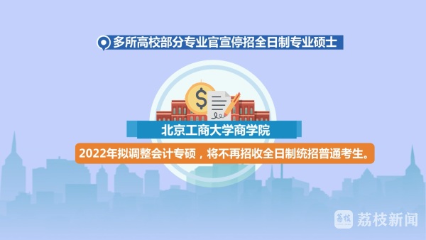 近日,北京工商大学商学院发出公告,2022 年拟调整会计专硕,将不再招收全日制统招普通考生。之前,四川大学、武汉大学、南昌大学、长安大学、中南财经政法大学的会计专业,已于今年停招全日制研究生。此外,中国人民大学和南京大学的新闻与传播专业、南开大学和北京师范大学的应用心理学专业,均只招收非全日制研究生。记者梳理后发现,近年停招全日制专业硕士研究生的,以会计、应用心理学、新闻与传播、法学以及管理类专业最为普遍。