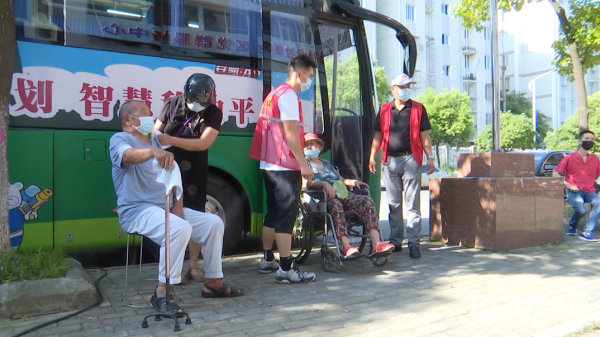 8月31号上午八点半,在南京江北新区葛塘街道接待寺社区门口,停放着一辆新冠疫苗接种车,村民们正有序排队等候接种。78岁的伏老先生,由于行动不便,一直没有前往医院接种新冠疫苗。听说接种车开到了家门口,伏先生的女儿便早早带着父亲赶到了现场,考虑到老人行动不便,护士专门走下车为老人接种。