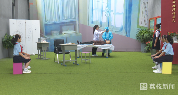 在徐州新元小学门口,同学们经过测温门有序进入校园。在学校的红色文化长廊,同学们演出了精心编排的课本剧《军神》,舞蹈《映山红》,来自淮海战役纪念馆的讲解员为孩子们讲述了红色文化长廊中的战役故事。