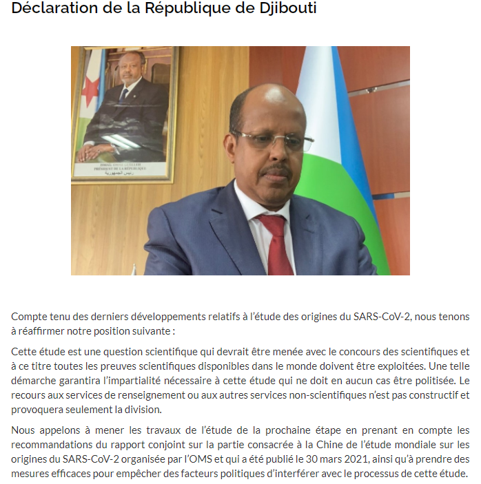 吉布提多次通过联名致函和单独致函世卫组织等方式表达反对溯源政治化的立场。(总台记者 吴婷)