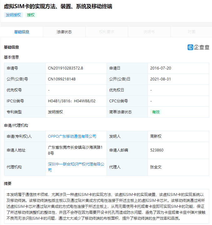 荔枝新闻讯 企查查显示,近日,OPPO广东移动通信有限公司“虚拟SIM卡的实现方法、装置、系统及移动终端”专利获授权,公开号为CN109921814B。