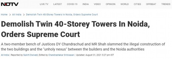 报道称,负责该案的两名印度大法官猛烈抨击该建筑为“非法建筑”,并称其是诺伊达地方政府和建筑商相互勾结、“邪恶连结”的结果。
