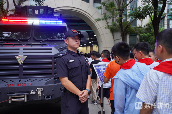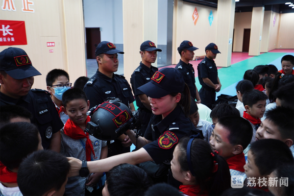 在走进“反恐精英”训练营的路上,炫酷的装甲车、威武的特警队、神秘的特警装备让小学生们热血沸腾。盐城盐南公安最“飒”女警杨蓉蓉为小朋友们一一介绍展示的警用装备,让小朋友们对神秘的特警力量及警用装备有所了解。战鹰突击队队员们跟小朋友们展开活泼生动的交流互动,让小学生们对特警的日常工作有了全新的了解。随后,战鹰突击队展示的擒敌拳、摔擒、校园反暴力演习将全场的气氛推向了高潮,现场掌声不断。盐城市警校教练员和特警队员联合,用边讲解边演练的方式,让小学生们了解如何防范校园砍杀、防范汽车冲撞、防范校园霸凌,树立科学、有效的安全自护意识。