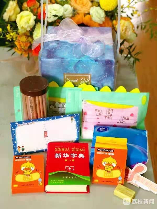 南京理工大学实验小学给一年级孩子们准备的“开学大礼包”内,足足有9件礼物。学校校务委员韩树人说,学校历来有一个传统,就是给一年级的新生赠送入学礼包,每一件礼物都饱含了老师对孩子们的祝福。今年的大礼包有一本字典、一支铅笔、一块橡皮、一包纸巾、一盒创可贴、一包儿童口罩、一张未来明信片、一盒格桑花花种等。