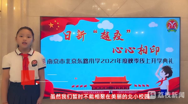 9月1日上午九点,南京市北京东路小学的全体师生相聚云端,举行以"日新'越疫',心心相印"为主题的2021年度秋季线上开学典礼。云上典礼首先举行线上升旗仪式。