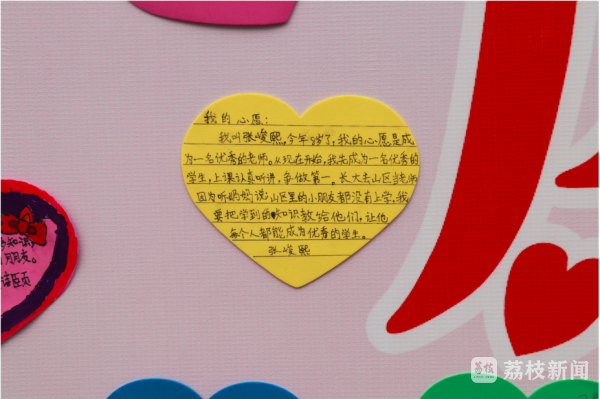 “我的心愿是成为一名优秀的老师,长大去山区当老师,因为听妈妈说,很多山区里的小朋友都没有上学。”“希望每次考试都有进步,每天都开开心心的!”“周山河小学是一座环境优美的学校,我更应该努力学习。”开学第一天,泰州市周山河小学组织孩子们在精美的爱心卡纸上,纷纷写下小小的心愿,并满心期待地贴到许愿墙上。