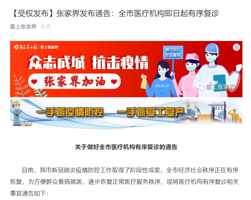 荔枝新闻讯 9月2日,张家界市新型冠状病毒感染肺炎疫情防控工作指挥部发布“关于做好全市医疗机构有序复诊的通告”。通告全文如下: