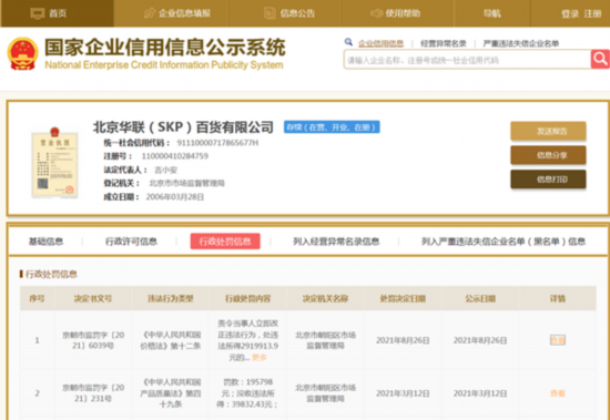 中国网财经9月2日讯(记者钟文鑫)据国家企业信用信息公示系统网站消息,近日,北京市朝阳区市场监督管理局发布关于对北京华联(SKP)百货有限公司(简称北京SKP)行政处罚决定书。